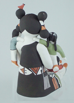 This is a beautiful, well-made and perfectly balanced storyteller made by Judy Lewis of the Acoma Pueblo. Judy is an acknowledged master potter from Acoma whose work is highly valued by collectors. Among Judy's best special creations are bowls and ollas painted to perfection with chard-like designs. But her sorytrellers are a sight to behold.