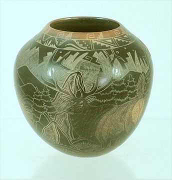 Kevin Naranjo, from Santa Clara Pueblo, is the son of noted miniaturist, Geri Naranjo. He has exhibited at Indian Market since 1994. In 1996 he was awarded a first prize in non-traditional pottery, sgraffito style without stones, black or black two-tone, and a first and a third prize in miniature pottery, sgraffito, all other, at the Indian Market in Santa Fe. In 1998 he was awarded a first prize in miniature pottery, sgraffito, all other.