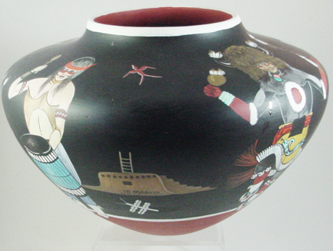 J.D. painted boldly colored dancers, Koshares, Indian women, and natural scenery with the flair and realism of painting on canvas. His eagle dancers are among the most attractive ever to be painted on pottery.