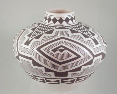 His favored designs originated from the Tularosa basin in southern New Mexico. These prehistoric swirl patterns, along with various fine-line work, are his trademark motifs. He duplicates ancient designs found on broken pottery shards that erode out of the ground. Myron uses all natural pigments to construct his high quality pottery., which is collected and prized all over.