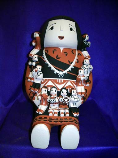 Dorothy Herrera is the daughter of deceased Cochiti potter Mary Frances Herrera. Mary Frances started making storytellers in the years after Helen Cordero invented the form at Cochiti in 1964. Dorothy learned the art from her mother and after her mother passed away around 1990 Dorothy was able to continue and expand upon her mother's work. Dorothy makes three distinct styles of storytellers (miniature, solid-body and hollow-body) as well as wonderful bears (both seated and standing on all fours). She will occasionally also do cats and owls. She has brought a great deal of creativity to the figurative style of pottery for which Cochiti Pueblo is so well known. Along with Ada Suina and Mary and Leonard Trujillo, she is considered a successor of Helen Cordero and is looked upon as one of the prominent artist to continue the tradition set by her.