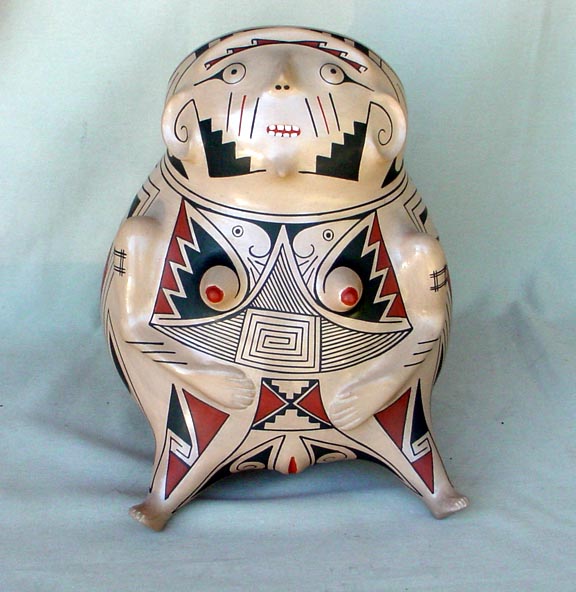Andres Villalba was the grand master of tradition and fidelity to traditional ways of pottery decoration. His effigies were legendary. And so was his rendition of the ancient Paquime designs to which he stuck faithfully to the very end. Andres died of pancreatic cancer in the spring of 2001 but his legend lives on in the person of his son, Sabino Villalba. Sabino's artistry is considered the equal of his famous father and is now actively sought by collectors world wide.